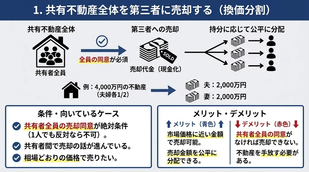 共有不動産全体を第三者に売却する 共有者全員で共有不動産全体を売却する方法。持分割合に応じて売却益は分配される。 共有者全員の同意が必要 共有者全員が共有不動産の売却に前向きな場合