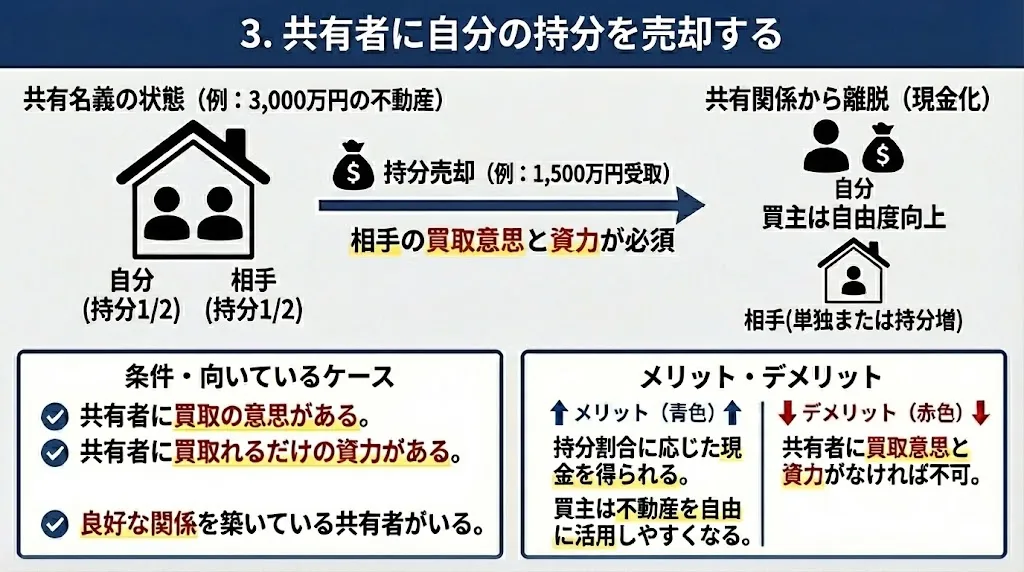 共有者に自分の持分を売却する 買取に賛同している共有者に自分の共有持分を売却する方法 売却相手の同意が必要 共有者側に持分を買い取る意思があり、持分を買い取れるほどの資金力がある場合