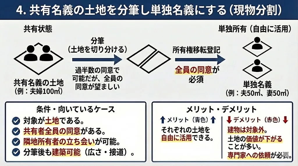 共有名義の土地を切り分けて、それぞれを単独名義にする方法 共有者全員の同意が必要。また境界確定の際には隣地所有者の立会いが必要 共有物が土地で、不公平にならない分け方ができる十分な広さがあり接道が保てる場合