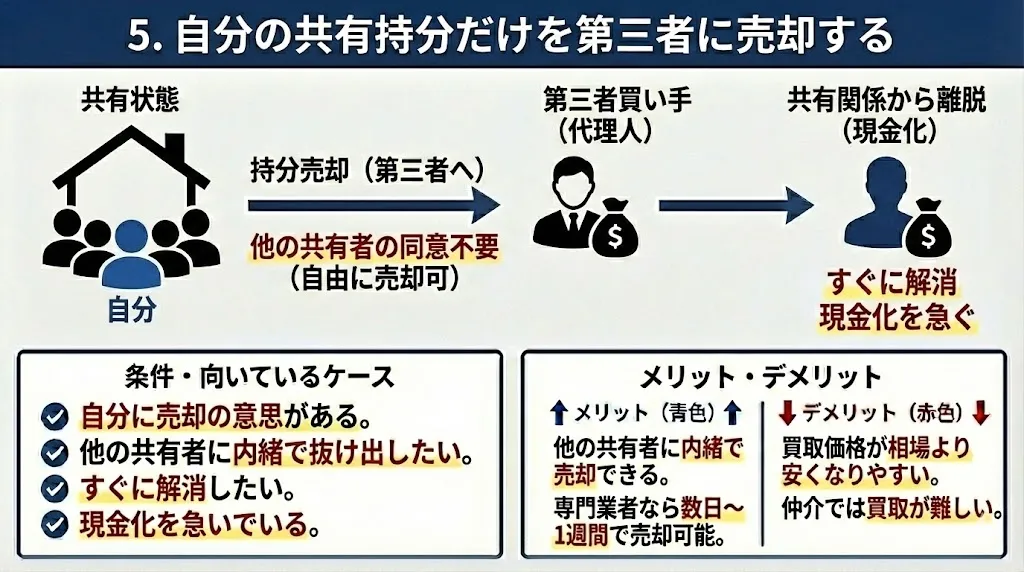 自分の持分を第三者に売却する 自分の共有持分を買取業者などの第三者に売却する方法 共有者の同意は不要 売却額が相場より安くなることを許容できる場合