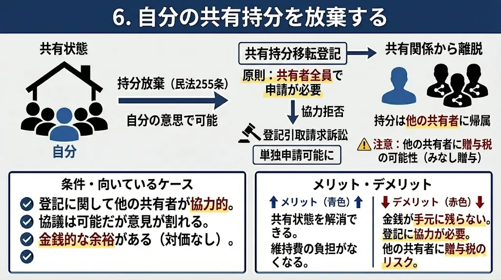 自分の持分を放棄する 自分の持分を放棄して他の共有者に帰属させる方法 放棄自体には共有者の同意は不要だが、移転登記には共有者の協力が必要 共有者に登記を協力してもらえる場合