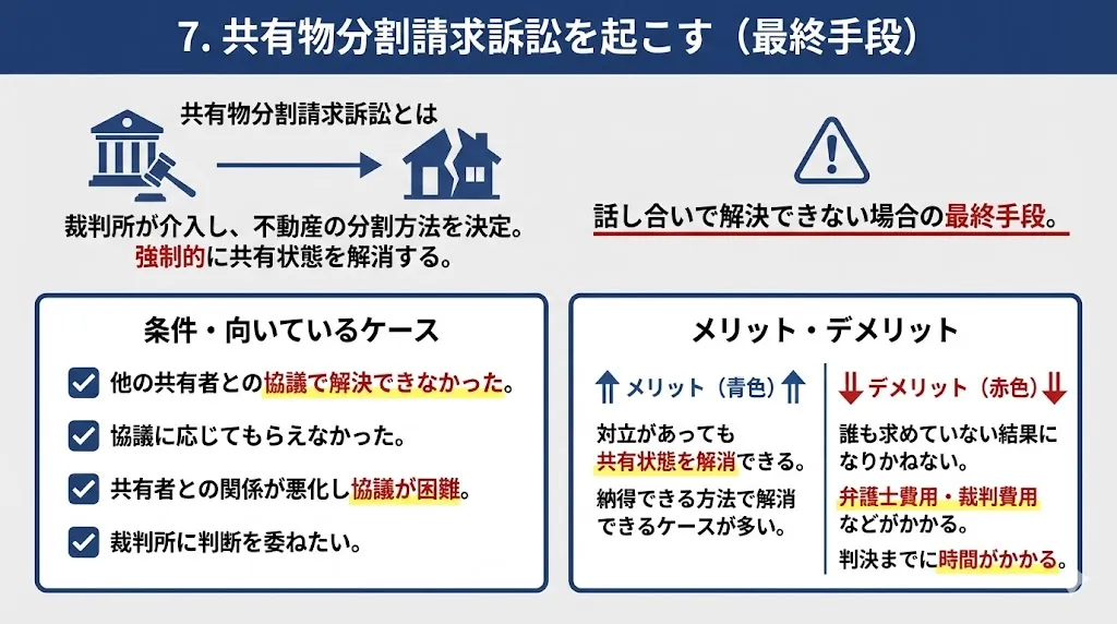 裁判所を介して共有状態を解消するための訴訟。裁判所の判断で強制的に共有不動産が分割される。 訴訟に共有者の同意は不要だが共有者全員を巻き込むことになる 共有者同士の話し合いでは共有状態が解消できない場合