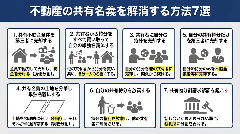 共有者全員の同意を得られるのであれば、共有不動産全体の売却や他の共有者からすべての持分を買い取ることで共有状態を解消できます。