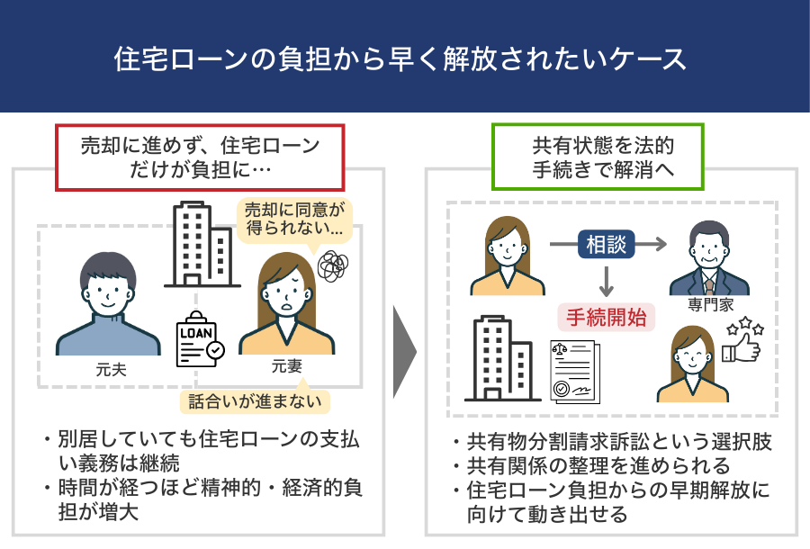 このように、できるだけ早く住宅ローンの負担から解放されたい場合に、共有物分割請求訴訟によって共有状態の解消を求めるという手段が取られることがあります。