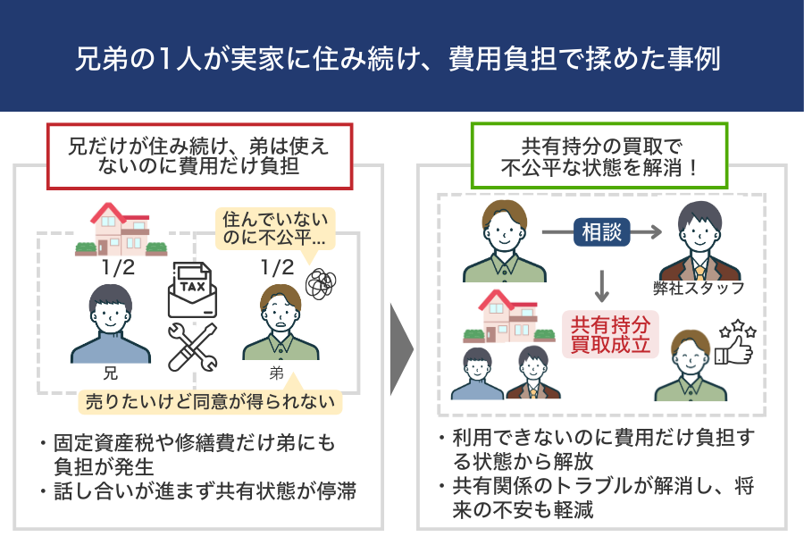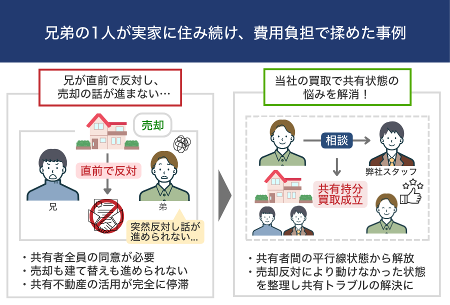 実際に当社にご相談いただいた事例では、兄弟2人で不動産を相続したものの、他の共有者が建物に居住しており、ご相談者様はまったく利用できない状態が続いていました。