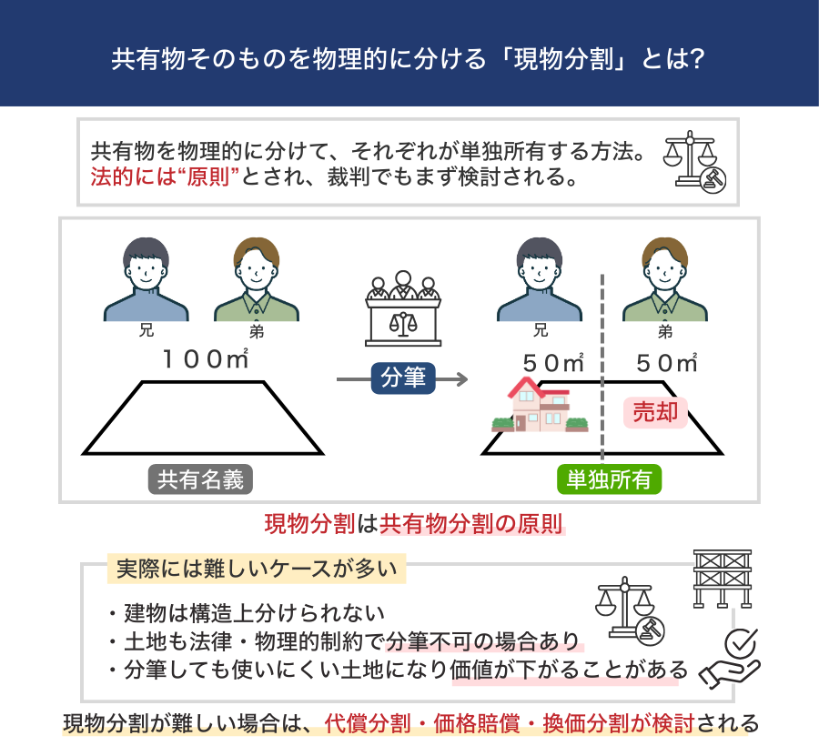 そのため、共有不動産の分割では、現物分割以外の方法が選択されることも多いと認識しておきましょう。