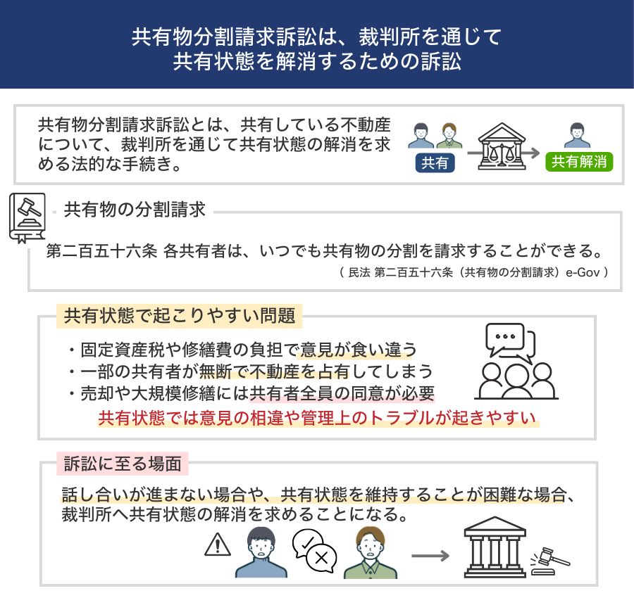 共有物分割請求訴訟とは、不動産などを共有している場合に、裁判所を通じて共有状態の解消を求める法的な手続きのことです。民法第256条では、以下のように「共有者はいつでも共有物の分割を請求することができる」と定められています。