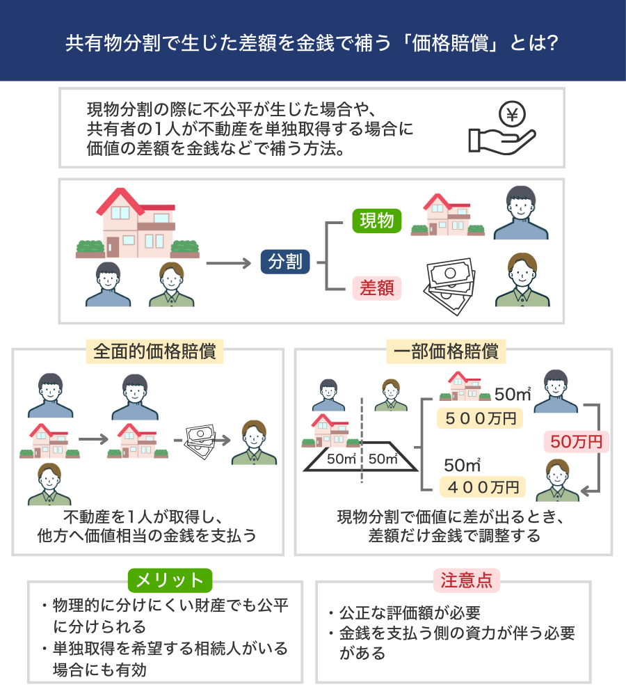 | 価格賠償 | 分割の際の差額を金銭などで補償する |