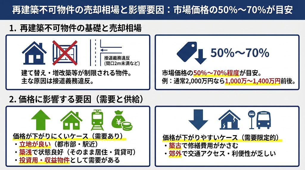 再建築不可物件の売却相場は、市場価格の50%〜70%程度が目安とされています。例えば、近隣の再建築可能な物件が2,000万円で取引されている場合、再建築不可物件の売却価格は1,000万〜1,400万円前後が目安です。