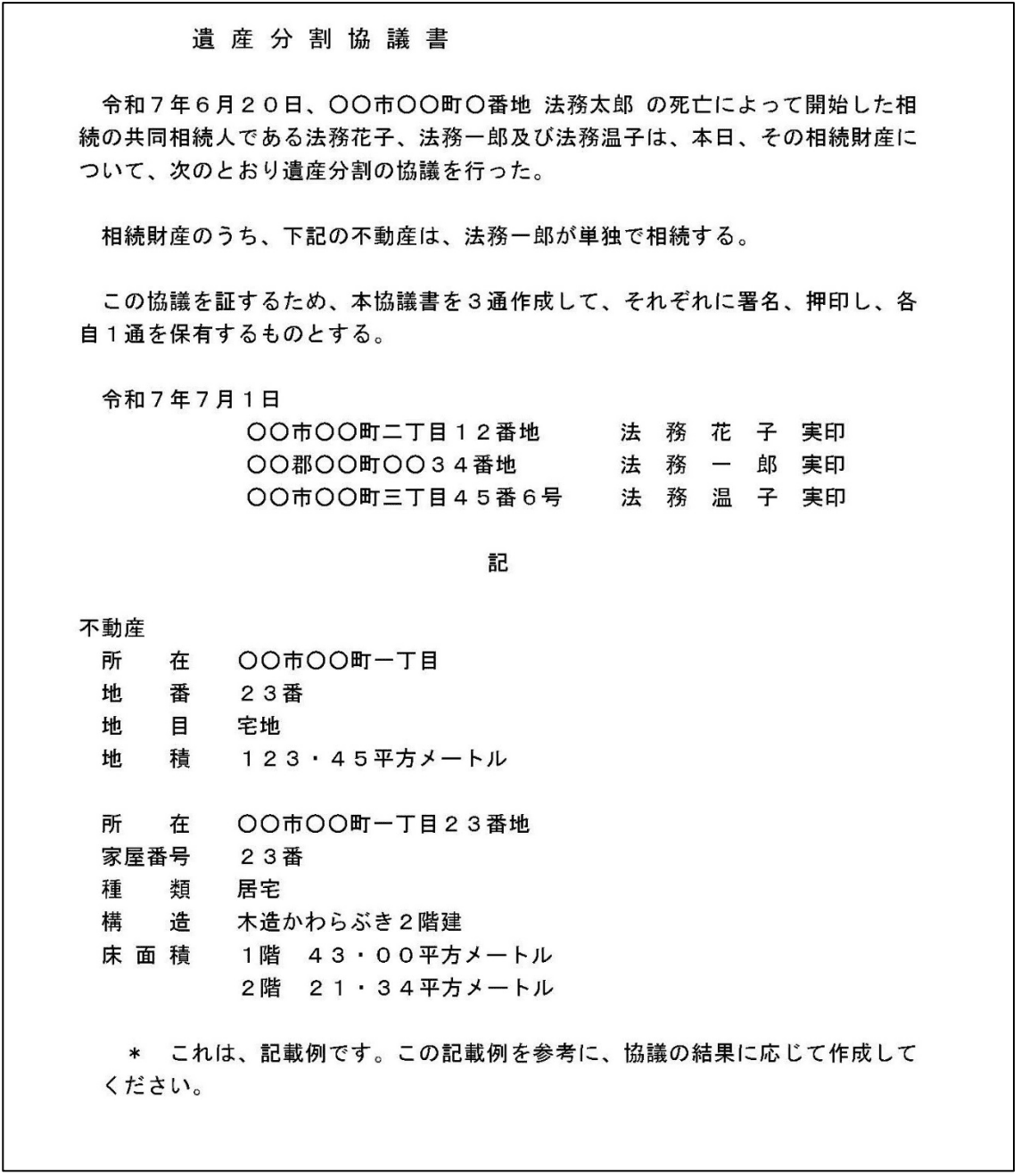 たとえば、土地・建物を複数人で共有相続するのか、特定の相続人が単独取得するのか、代償金を用いて割合調整するのかなどを話し合い、協議書に明記します。