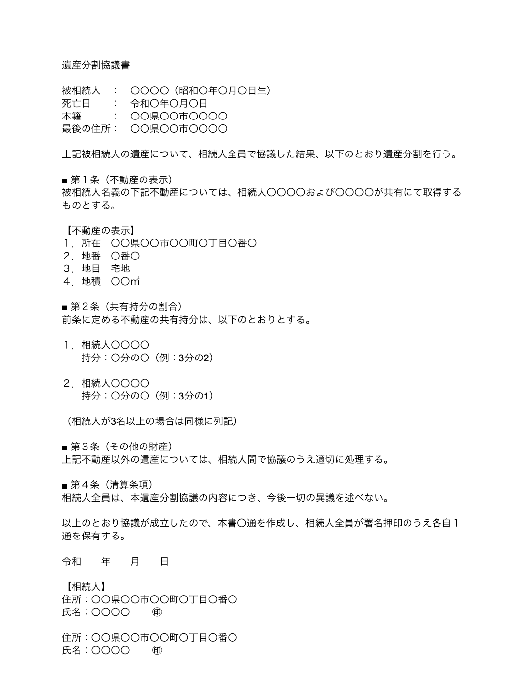 遺産分割協議書に所定の様式はありませんが、不備を出さないためにも、以下の雛形を参考にしながら記入してみましょう。