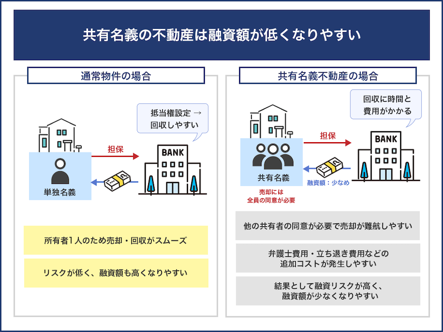 こうした追加コストがあるため、金融機関は単独所有の不動産よりも低い融資額を提示することが多いのです。特に、次のようなケースでは融資額が低くなる傾向があります。