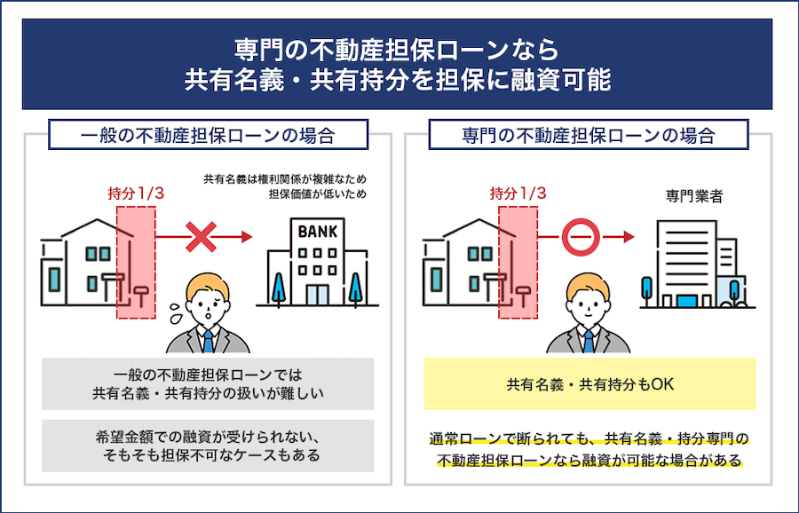 専門の不動産担保ローンであれば共有名義や共有持分の不動産を担保に借入できる