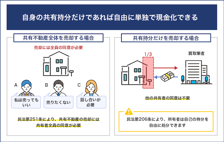 共有持分だけであれば自由に処分が可能であり、前述の通り需要は低いですが、持分のみを売却することも不可能ではありません。そのため、「共有持分のみを担保に借入できない」「必要なお金を調達できそうにない」といった場合は、自身の共有持分を売却して現金化するのも1つの選択肢です。
