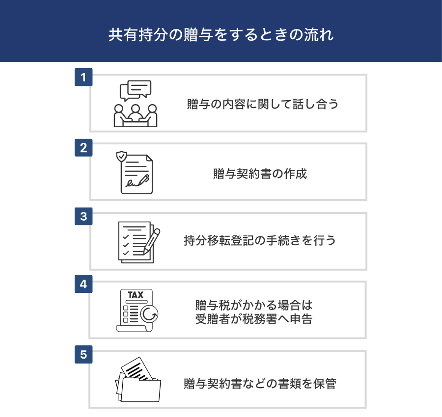 ここからは共有持分の贈与を行う際の流れを解説します。贈与の流れは以下の通りです。