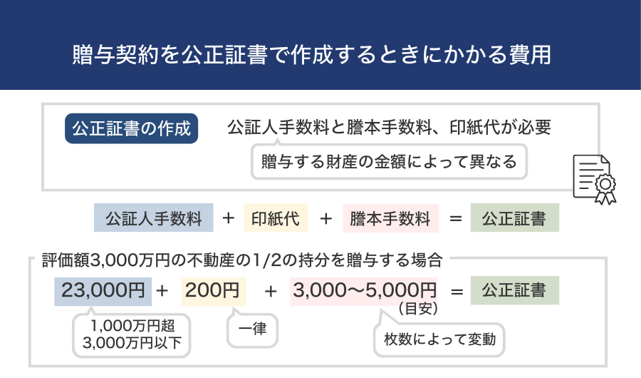 公正証書の作成には、公証人手数料と謄本手数料、印紙代が必要です。公証人手数料は贈与する財産の金額によって異なります。