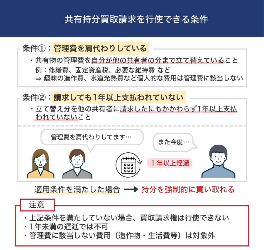 民法上の共有持分買取請求権を行使するためには、以下の条件を満たす必要があります。