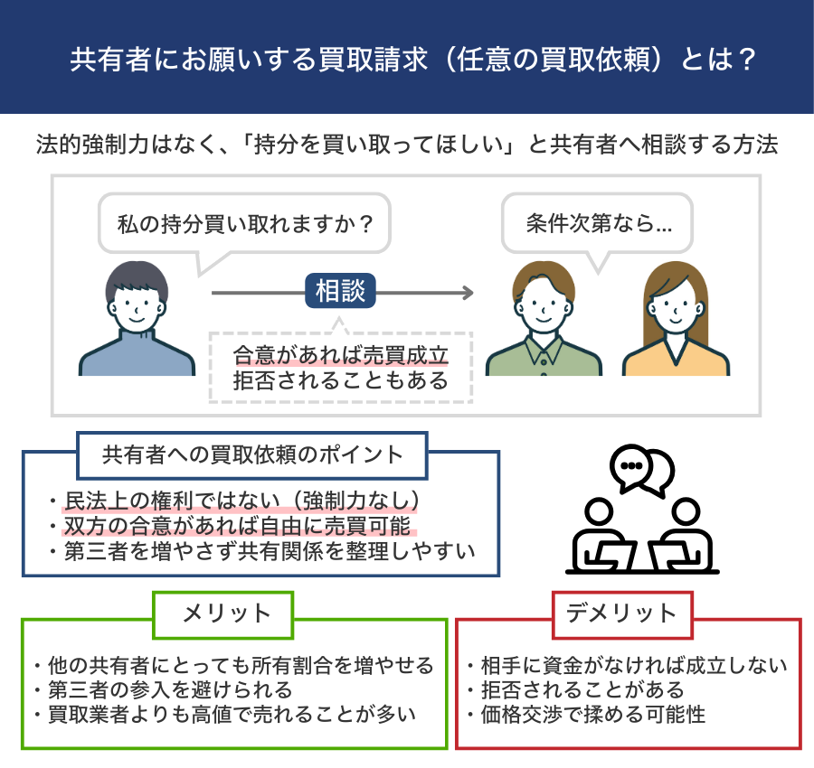 民法上の権利ではなく、他の共有者に「共有持分を買い取りたい」とお願いすることを「買取請求」と呼ぶ場合もあります。