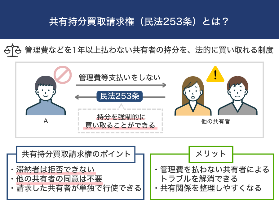 共有者が管理費の支払いなど、共有者としての義務を履行しない場合、他の共有者はその共有者に対して共有持分の買取請求を行うことができます。これは民法で認められた権利であり、権利が行使された場合、対象となる共有者はこれを拒否することができません。