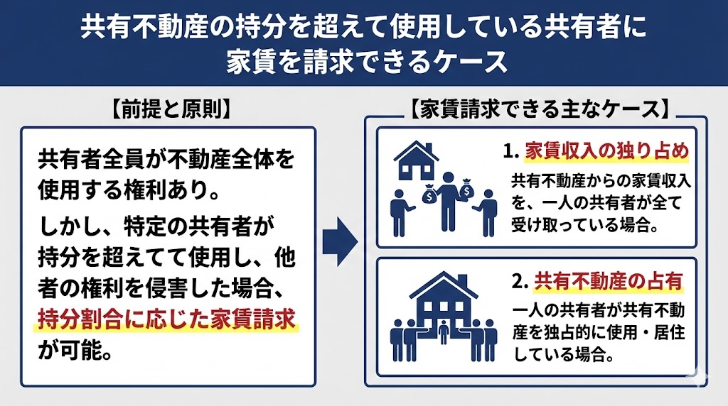 ただし、共有不動産の持分を超えて使用しているからといって、すべてのケースで家賃請求できるわけではありません。