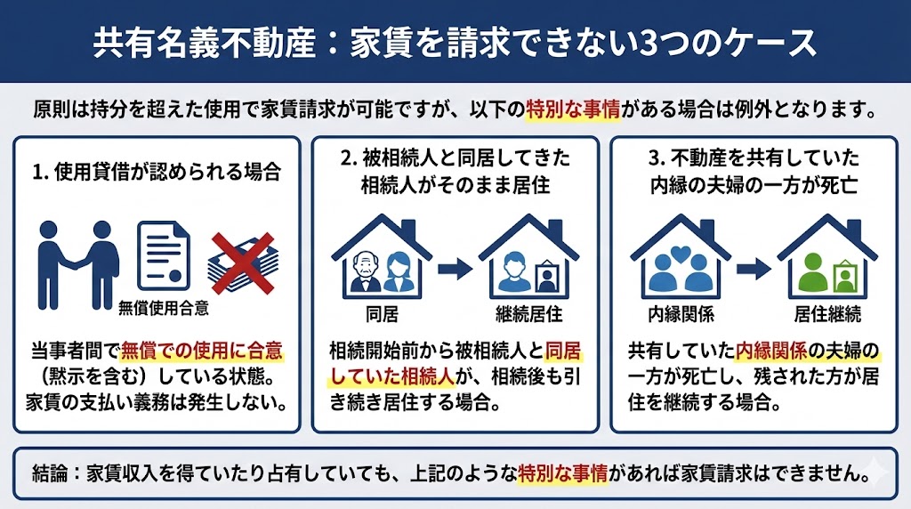 特定の共有者が自己持分を超えて使用している場合でも、他の共有者が家賃を請求できないケースもあります。