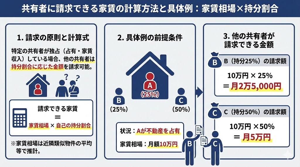 ここからは、共有者に請求する家賃の計算方法や金額について詳しく解説します。