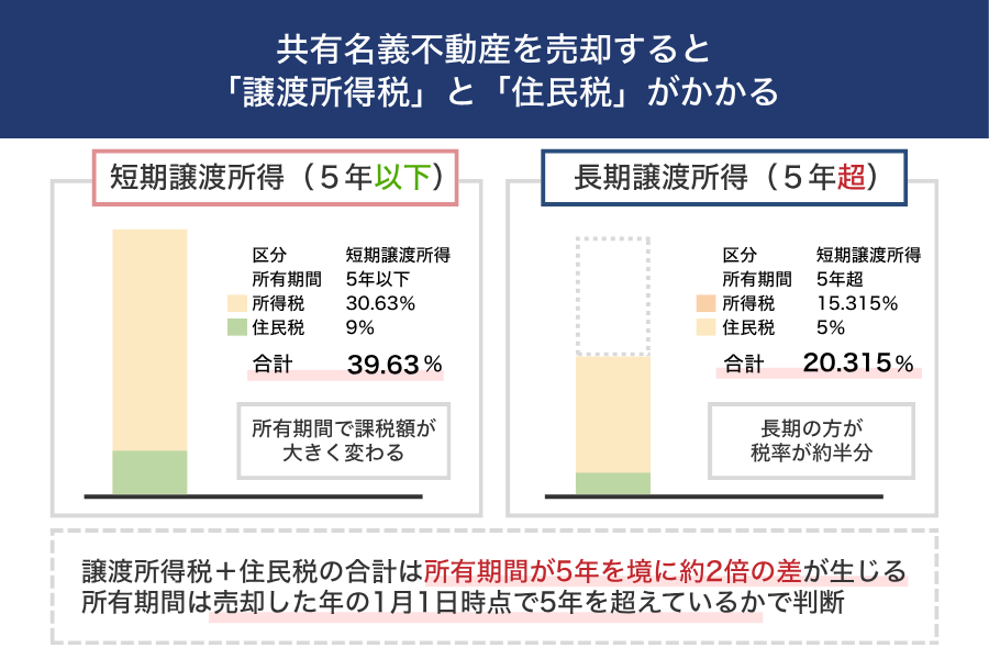 なお、共有名義不動産の売却に関係する税金のなかで、とくに計算が複雑なのは「譲渡所得税・住民税」です。不動産の所有期間が5年超かどうか、共有者それぞれの持分割合などが影響し、税額が大きく変わってきます。