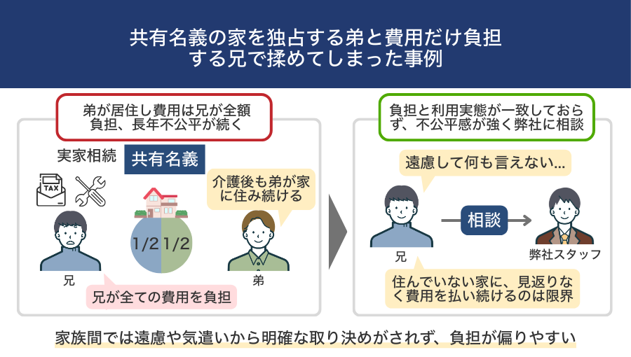 しかし介護が終わり、両親が他界した後も弟様はそのまま家に住み続け、「固定資産税は兄が全額負担」「修繕費や火災保険も兄が支払い」「弟は使用しているにもかかわらず、費用を出す気配がない」という状況が何年も続いていたのです。