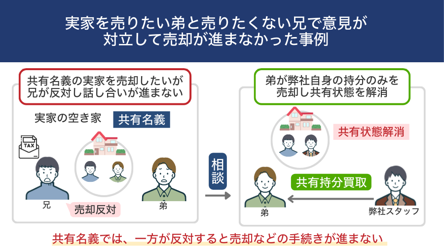 「このままでは、精神的にも経済的にも持たない」との思いから、弊社にご相談をいただきました。弟様は、「共有しているのに、責任と負担が全部こちらに偏っている。最初から一人で所有していた方がまだマシだった」と、非常に悔しそうに語っておられました。