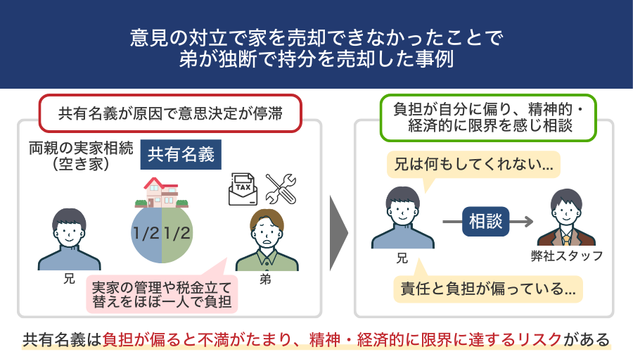 弊社の過去事例でも、管理を一手に引き受けていた弟が、兄の無関心さに限界を感じて持分売却を決意したケースがありました。その際、兄は「勝手に売るなんて聞いてない」と反発し、兄弟関係が完全に崩壊したという例もあります。
