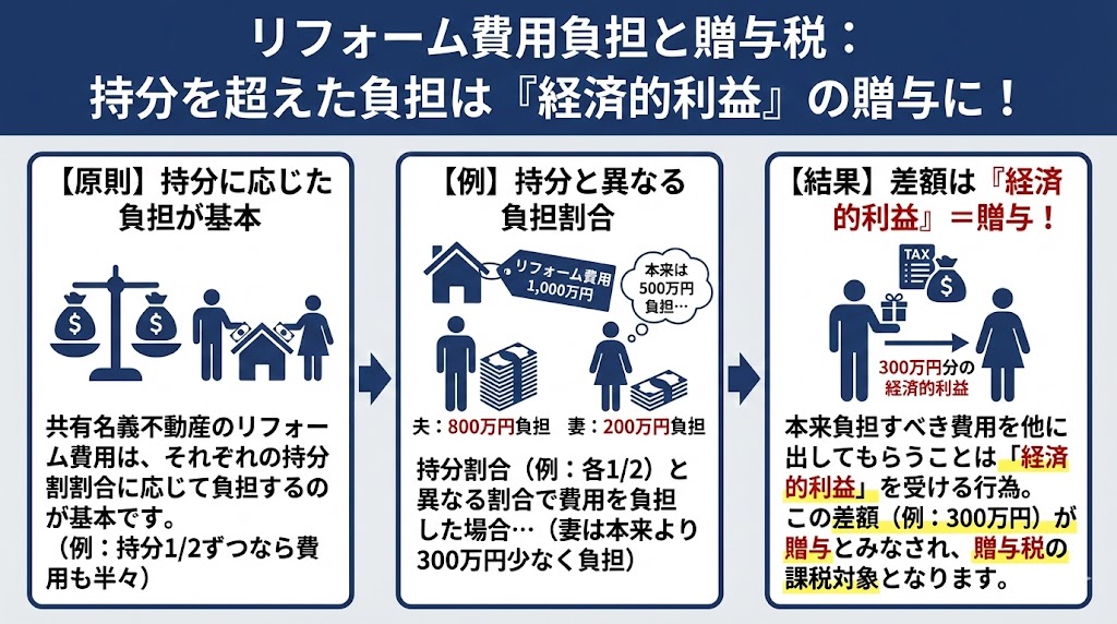 共有名義の不動産をリフォームする場合、自分の持分割合に応じた費用を負担しない場合に贈与税が発生します。なぜなら、本来支払うべき費用を相手が払っていることで、その分経済的利益を受けているとみなされるからです。