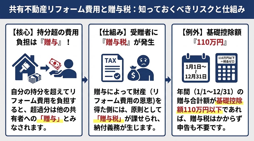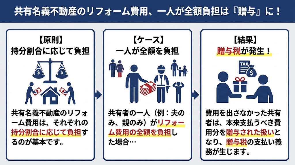 共有者の一人が全額負担すると、費用を出さなかった共有者は本来支払うべき費用分を贈与された扱いになります。自分の持分がある不動産を無償でリフォームしたことになるため、贈与税を支払わなければならないのです。