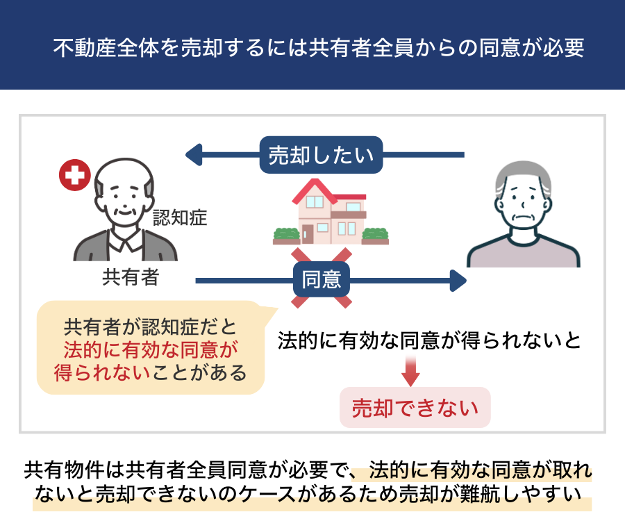 共有名義人が認知症になると不動産全体の売却が難しくなる