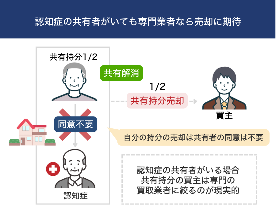 そのため、認知症を患っている共有者がおり、その人から同意を得るのが難しい状況で共有状態から抜け出したい場合には持分のみを売却することも1つの手になります。