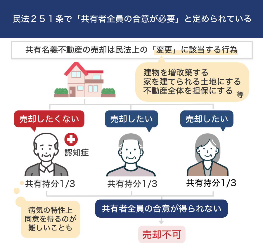 「変更行為を行うには共有者からの同意を得る必要がある」と定められているために、共有名義不動産全体を売却するには、認知症を患っている共有者を含めた全員から同意を得なければならないのです。