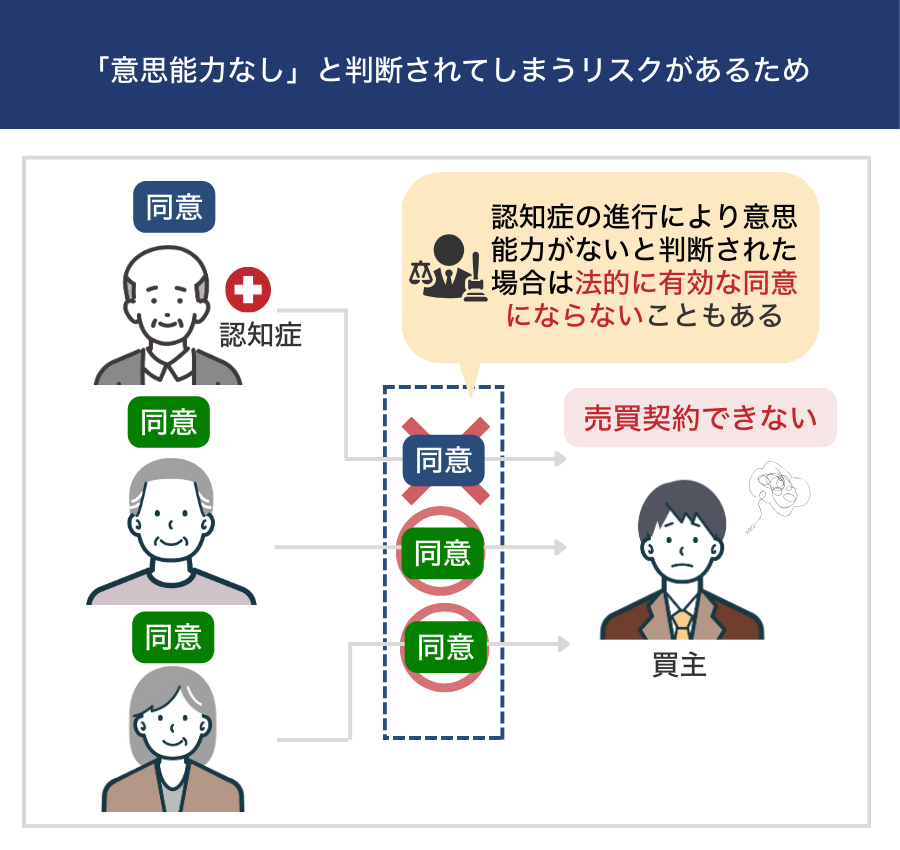 そこに「認知症」という病気の特性が加わると、問題はさらに複雑化しやすいです。その結果、共有者としての同意を得るのが難しくなりやすいうえに、仮に同意が得られても契約が無効とされるリスクが生じてしまいます。