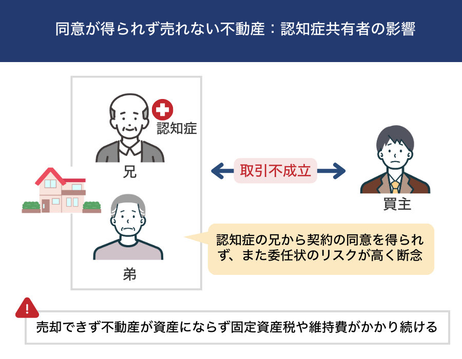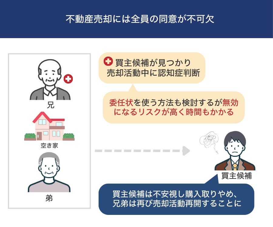 買主候補も見つかり、価格交渉も大詰めに差し掛かったなか、共有者の一人であるお兄様が認知症と診断されてしまったようです。