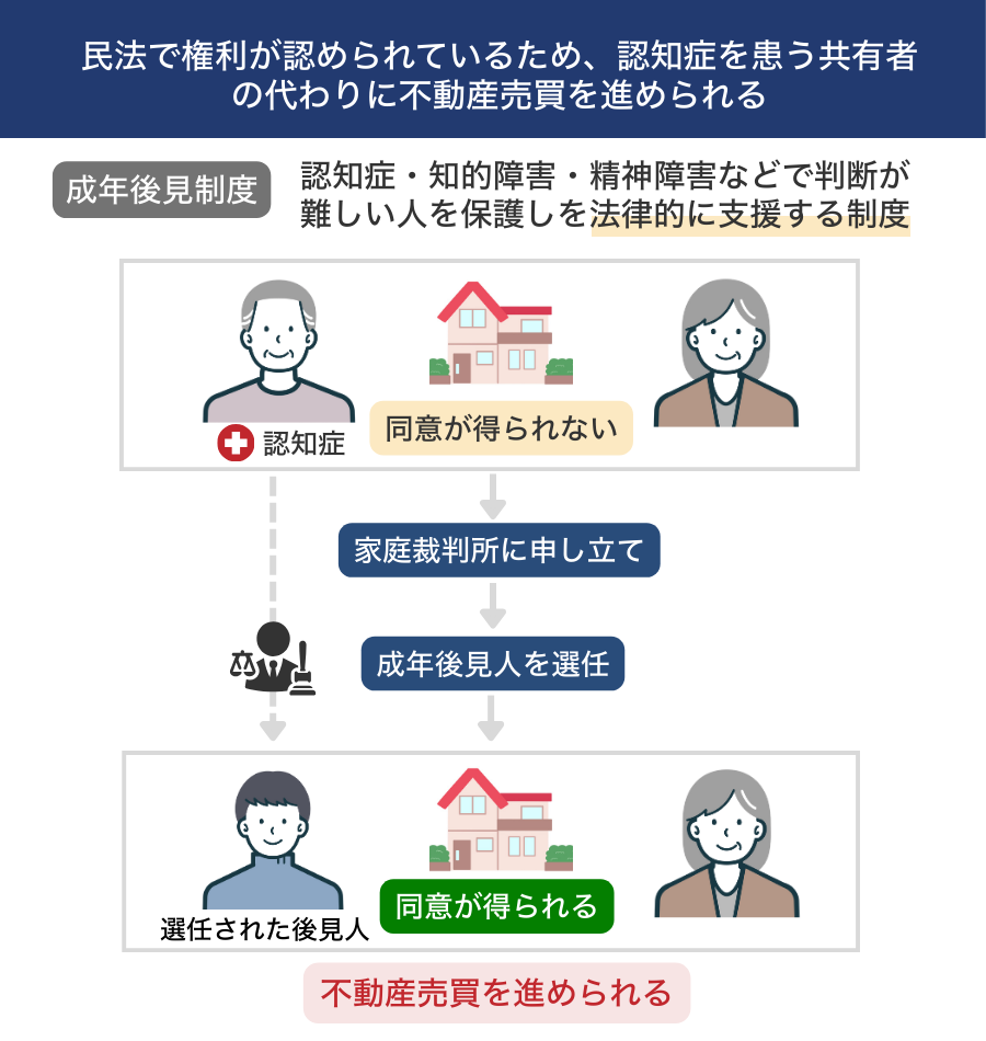 共有名義人が認知症を患ってしまった場合でも、成年後見制度を利用することで不動産全体の売却が可能になります。