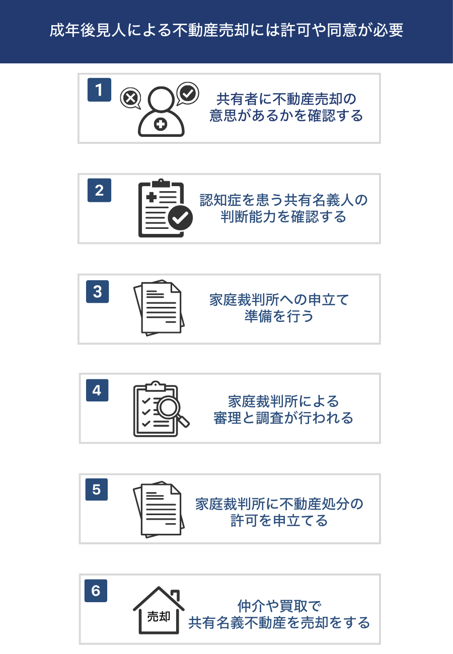審理の結果、家庭裁判所によって後見人が選任された後は、後見人が認知症の共有者を代理して売却の同意を行うことが可能になります。