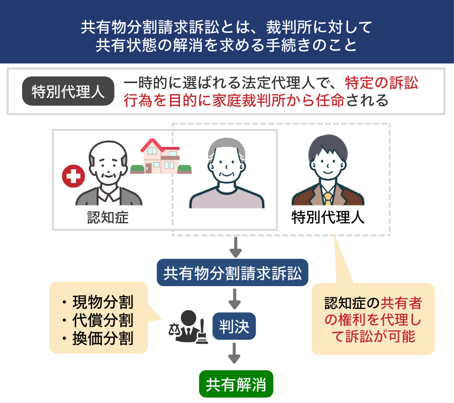 認知症の共有者がいる場合、特別代理人を選任し、裁判所に「共有物分割請求訴訟」を提起する方法も有効です。