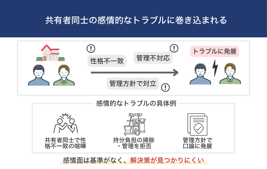 - 共有者同士の感情的なトラブルに巻き込まれる