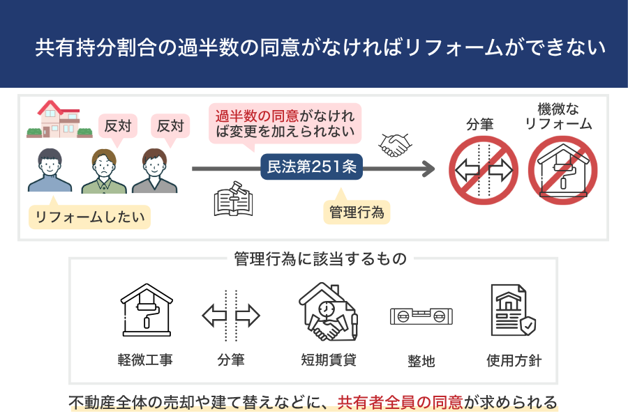 | 共有持分割合の過半数の同意がなければリフォームができない | 共有持分の過半数を有する共有者が反対すると、軽微なリフォーム、不動産の使用方針の決定、分筆などができなくなる |