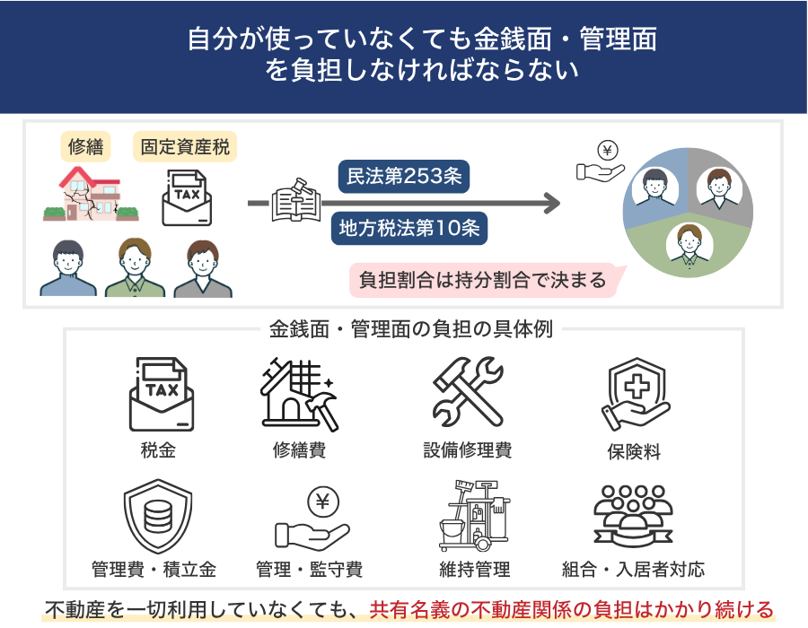 | 自分が使っていなくても金銭面・管理面を負担しなければならない | 共有名義不動産の金銭面・管理面の負担は、不動産の使用状況には関係なく共有持分割合で決まるのが原則 |