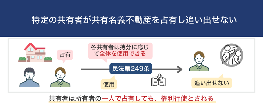 しかし、共有者の1人が共有名義不動産を占有したとしても、それだけを理由に占有者を追い出すことは法律で認められていません。なぜなら、民法第249条にて「各共有者は、共有物の全部について持分に応じた使用ができる」と定められているからです。