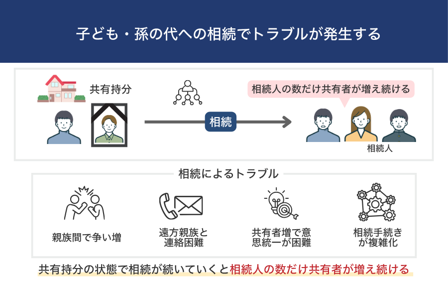 | 子ども・孫の代への相続でトラブルが発生する | 仲が悪い人や遠方の親戚などの共有者が増え続ける、権利が分散し続けるなど、子どもや孫の不動産の管理負担が大きくなる |