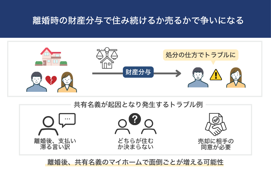 | 離婚時の財産分与で住み続けるか売るかで争いになる | 離婚するだけでは共有名義は解消されないので、そのままでは離婚後もトラブルに巻き込まれるリスクがある |