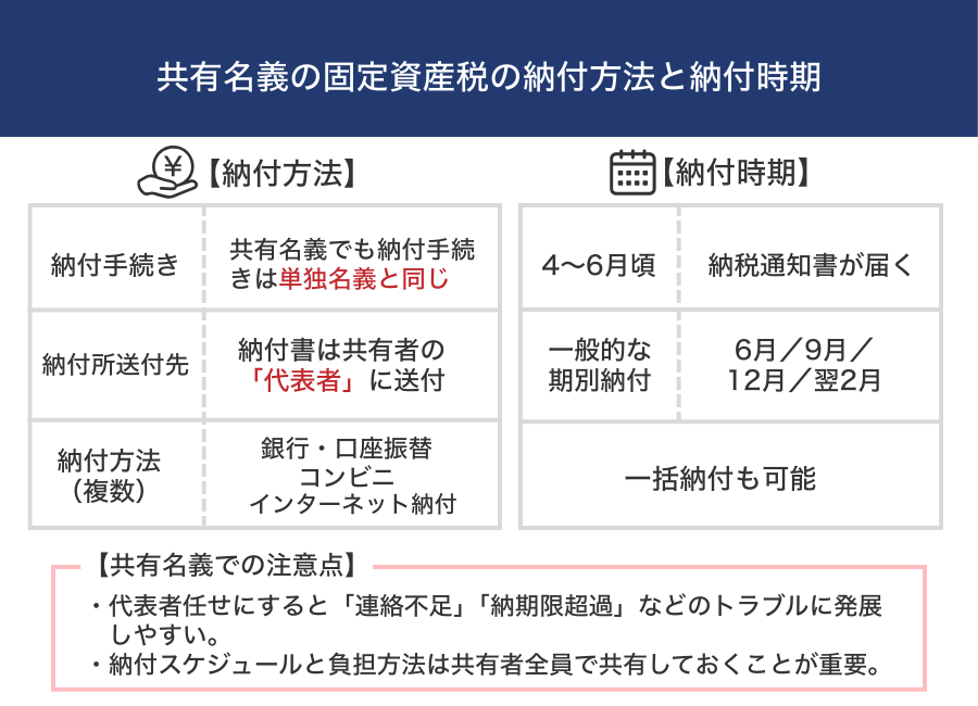 共有名義の場合は代表者のもとに納付書が届くため、共有者全員で納付スケジュールを共有しておくことが大切です。