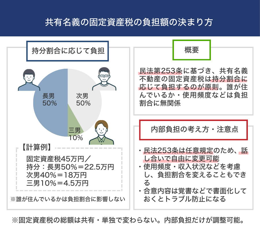 まず原則として、共有名義の不動産に関する費用負担は民法第253条に従い、各共有者の持分割合に応じて負担するのが原則とされています。実務上も、固定資産税の負担割合は持分割合を基準に決めるケースが一般的です。