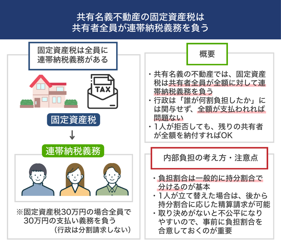 仮に、共有名義不動産の固定資産税が30万円の場合、その30万円については共有者全員が連帯して納税義務を負います。