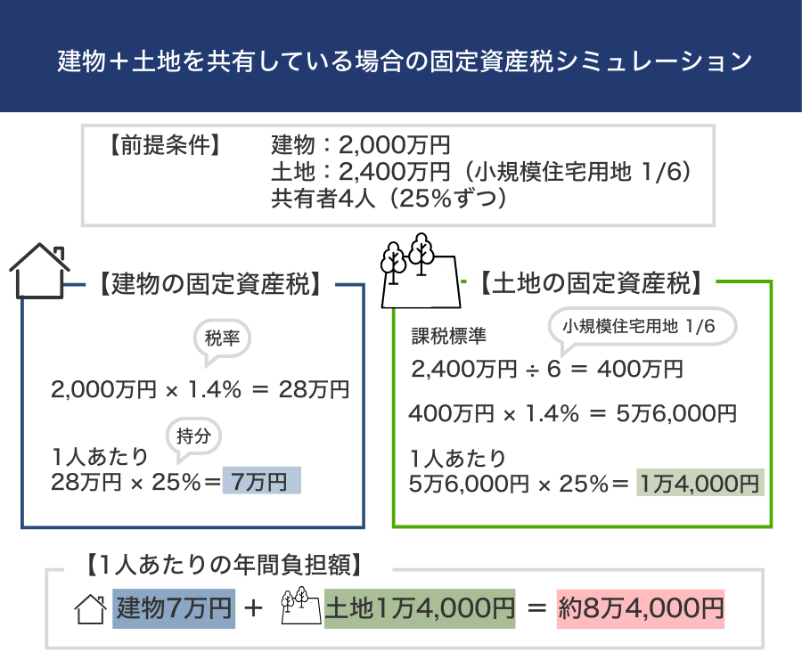 ここからは、建物・土地・両方を共有しているケースについて、固定資産税の目安額と、共有者1人あたりの負担額がどれくらいになるのかを具体的にシミュレーションします。